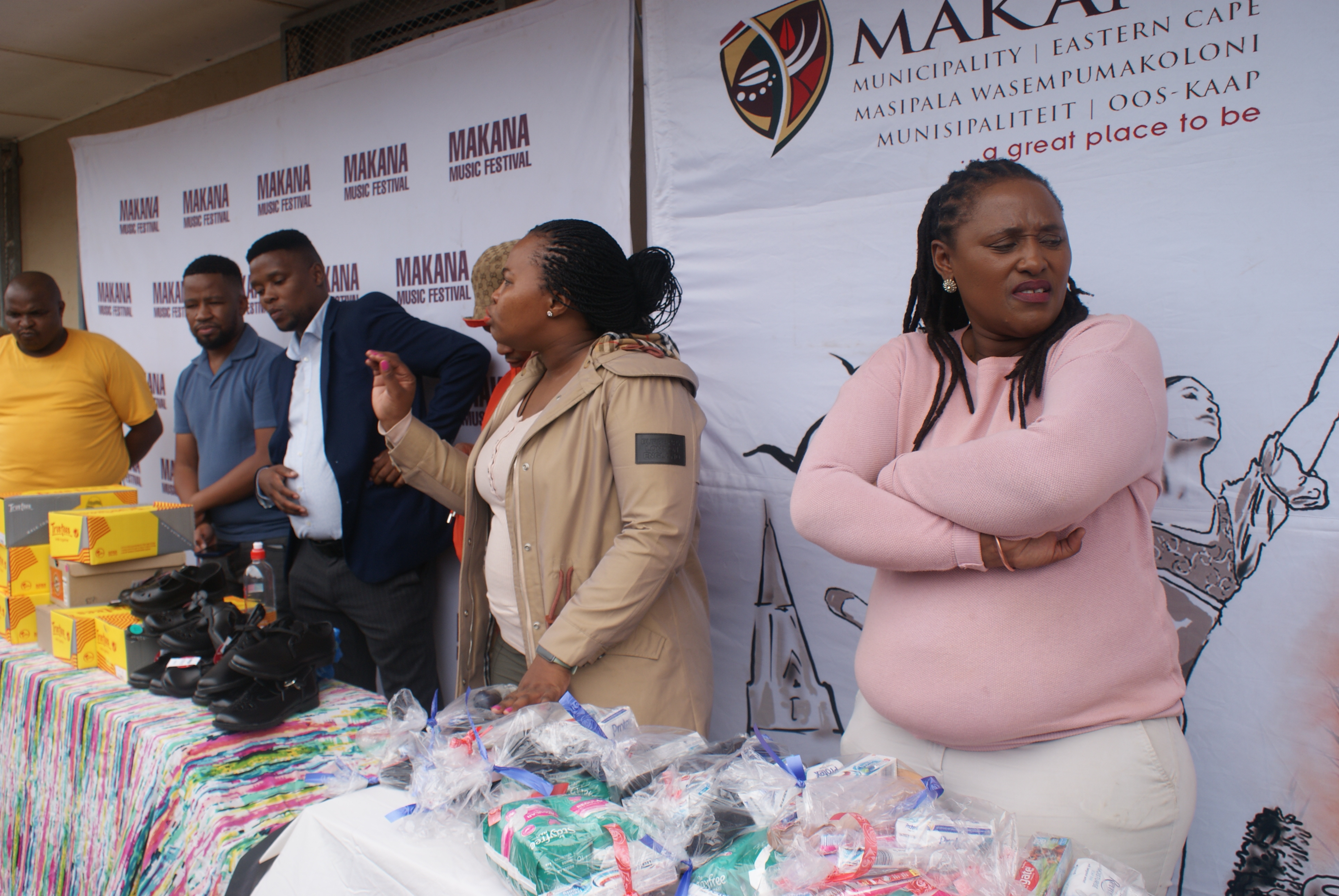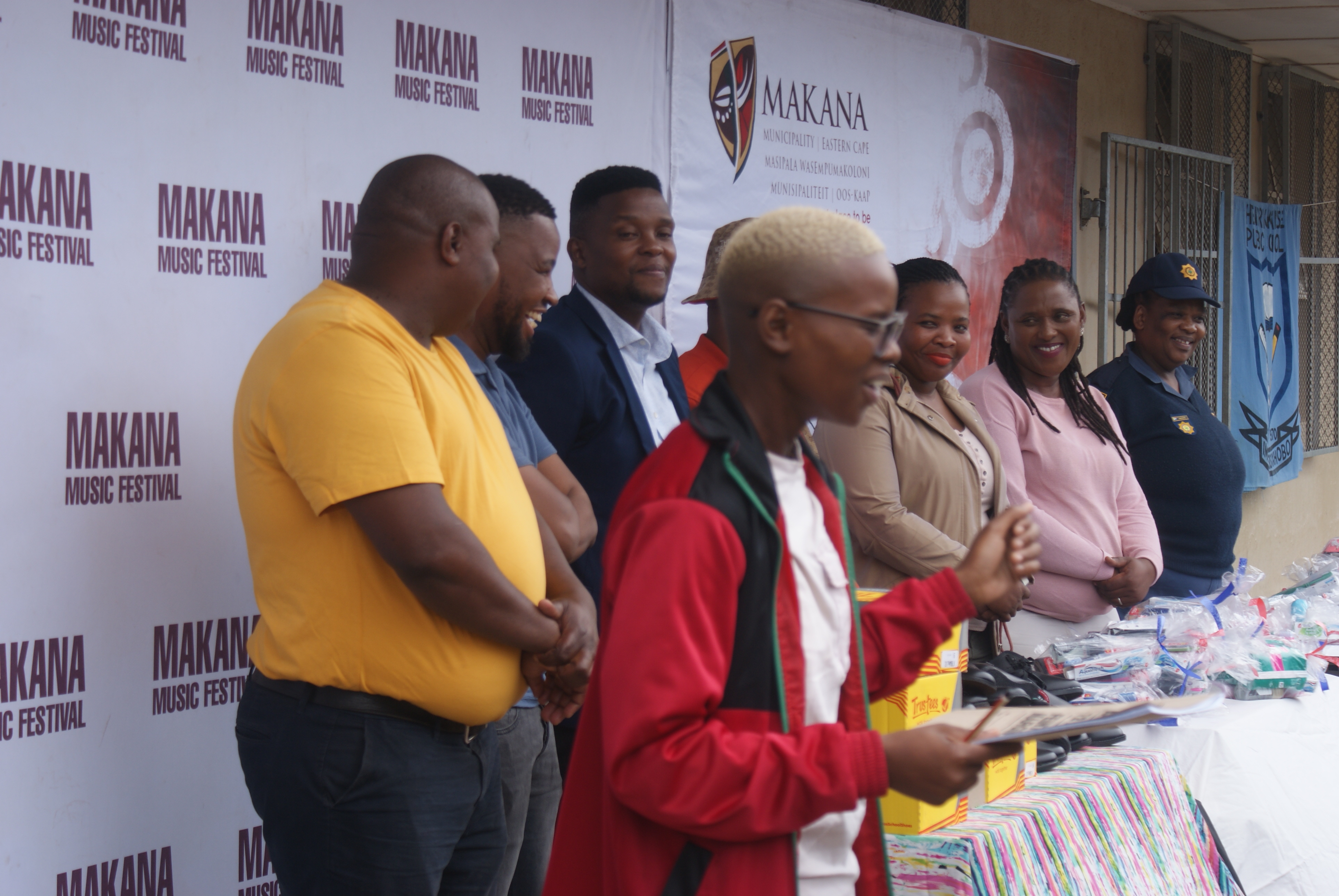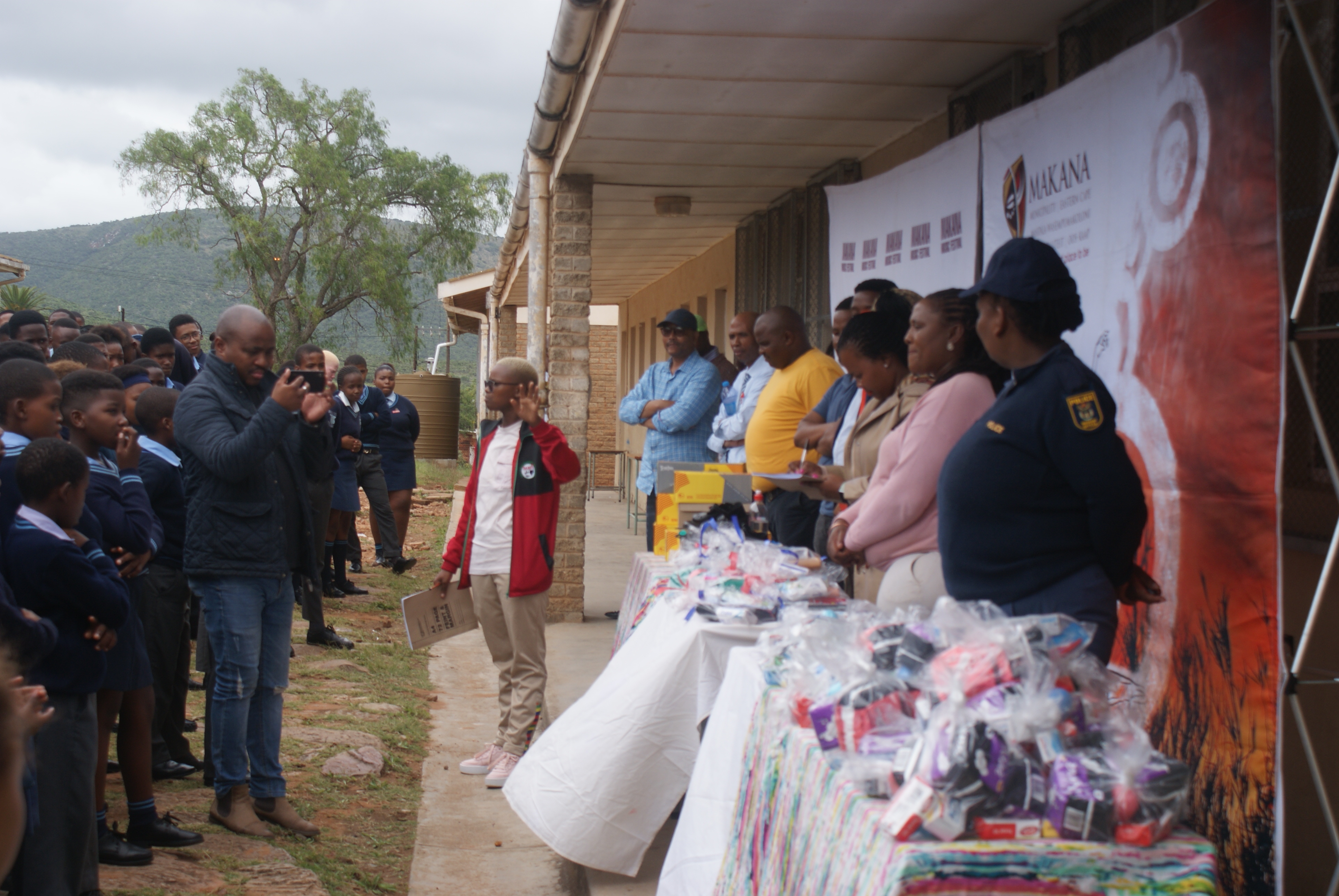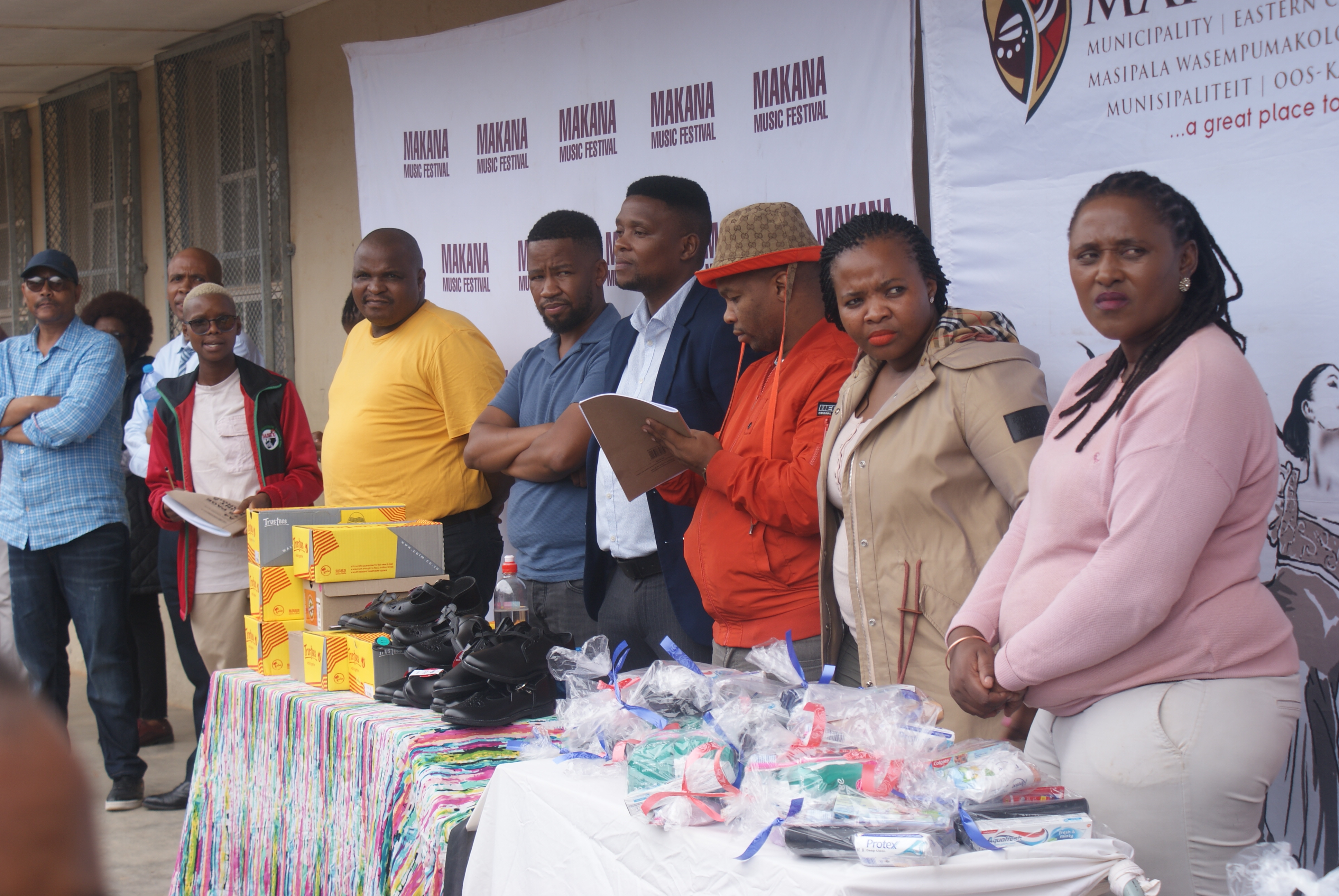 Makana Local Municipality led by the Executive Mayor, Cllr Yandiswa Vara and Mayoral Committee member Cllr Thandolwethu Vayo as well as number of community leaders, such as Umhlobo Wenene presenter Mafa Bavuma, Siyabulela Ivy Madyo from Lutifusion Pty Ltd (Makana Music Festival Organiser), Nomawethu Stuurman from the Pumba Foundation and SAPS donated toiletries, uniform, school shoes, sanitary towels and more to learners of Hendrik Kanise Combined School in Alicedale. The school obtained a 100 percent pass rate last year. All the speakers encouraged the learners to do their best and to stay away from drugs.